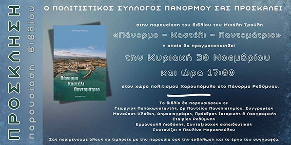 Το νέο βιβλίο του ιστορικού ερευνητή και συγγραφέα Μιχάλη Τρούλη, με τίτλο «Πάνορμο – Καστέλι – Πανταμάτριο», παρουσιάζεται την