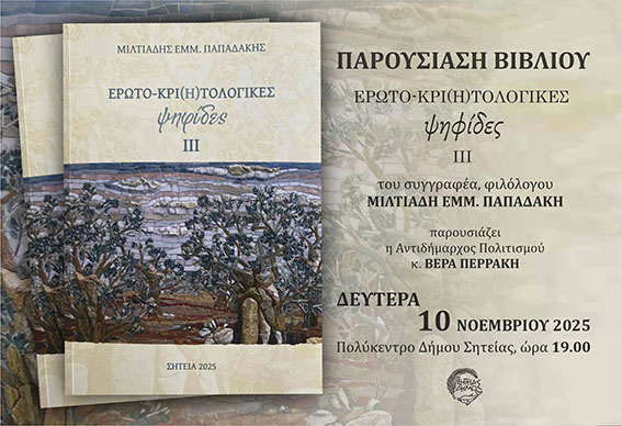 Το Πολύκεντρο του Δήμου Σητείας φιλοξενεί την παρουσίαση του νέου βιβλίου του συγγραφέα και φιλολόγου Μιλτιάδη Παπαδάκη, με τίτλο «Ερωτο-κρι(η)τολογικές ψηφίδες» ΙΙΙ, τη