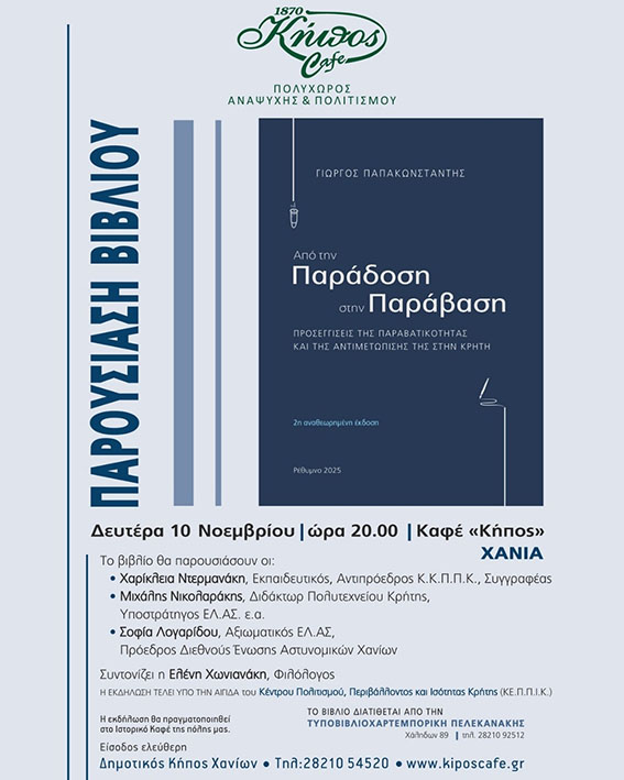 την παρουσίαση του νέου βιβλίου του Γιώργου Παπακωνσταντή, με τίτλο «Από την Παράδοση στην Παράβαση – Προσεγγίσεις της Παραβατικότητας και της Αντιμετώπισής της στην Κρήτη».