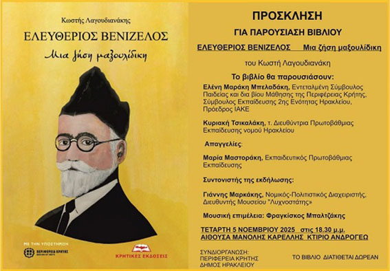 Η παρουσίαση του βιβλίου του Κωστή Λαγουδιανάκη με τίτλο «Ελευθέριος Βενιζέλος – Μια ζωή μαξουλίδικη» θα πραγματοποιηθεί την