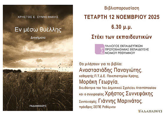 Ο Σύλλογος Εκπαιδευτικών Πρωτοβάθμιας Εκπαίδευσης Νομού Ρεθύμνου και οι Εκδόσεις Ραδάμανθυς παρουσιάζουν το νέο βιβλίο του δασκάλου Χρήστου Συννεφάκη, με τίτλο «Εν μέσω θυέλλης».