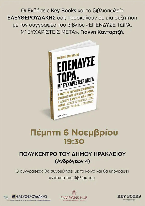 Το νέο βιβλίο του Γιάννη Κανταρτζή, με τίτλο «Επένδυσε τώρα, μ’ ευχαριστείς μετά», θα παρουσιαστεί στο Πολύκεντρο του Δήμου Ηρακλείου (Ανδρόγεω 4), την