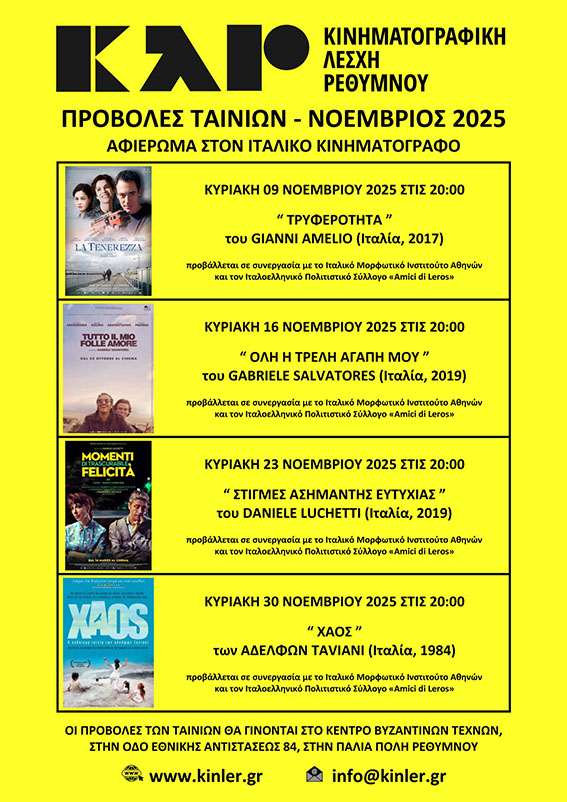 Η Κινηματογραφική Λέσχη Ρεθύμνου σε συνεργασία με το Ιταλικό Μορφωτικό Ινστιτούτο Αθηνών, τον Ιταλοελληνικό Πολιτιστικό Σύλλογο «Amici di Leros» και με την υποστήριξη της Ομοσπονδίας Κινηματογραφικών Λεσχών Ελλάδας (ΟΚΛΕ), διοργανώνει για τον Νοέμβριο του 2025 ένα αφιέρωμα στον Ιταλικό Κινηματογράφο με την προβολή τεσσάρων ταινιών.
