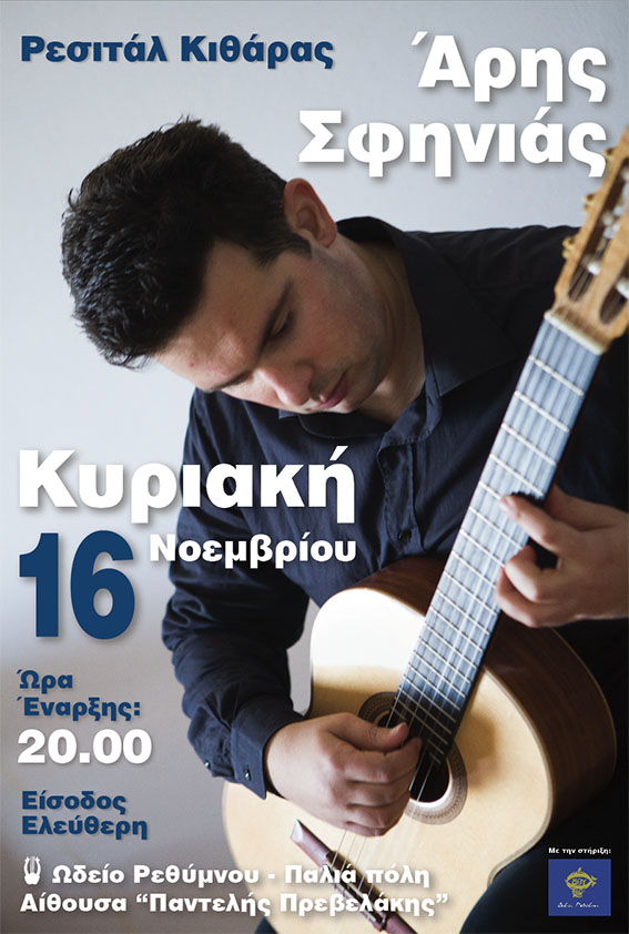 στην αίθουσα «Παντελής Πρεβελάκης» στην παλιά πόλη. Ο Άρης Σφηνιάς θα παρουσιάσει ένα ρεσιτάλ κιθάρας αφιερωμένο σε έργα για σόλο κιθάρα από τη Λατινική Αμερική και την Ισπανία, προσκαλώντας το κοινό σε ένα ταξίδι μελωδιών και ρυθμών γεμάτο πάθος και χρώμα.