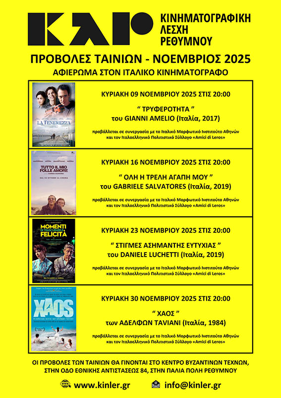 Η Κινηματογραφική Λέσχη Ρεθύμνου συνεχίζει το αφιέρωμά της στον Ιταλικό Κινηματογράφο με την προβολή της ταινίας «Στιγμές ασήμαντης ευτυχίας» στο Κέντρο Βυζαντινών Τεχνών, στην οδό Εθνικής Αντιστάσεως 84, στην παλιά πόλη του Ρεθύμνου, την