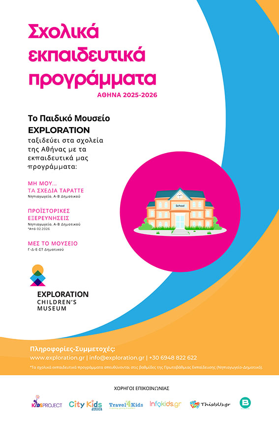Το Παιδικό Μουσείο Exploration, το πρώτο κινητό παιδικό μουσείο της Ελλάδας, ετοιμάζει τις βαλίτσες του και έρχεται στα σχολεία της Αθήνας τη σχολική χρονιά 2025 – 2026! Με τις συλλογές, τα εκθέματα και τους ερμηνευτές του, μετατρέπει κάθε σχολική αίθουσα σε έναν μικρό, ζωντανό κόσμο εξερεύνησης.