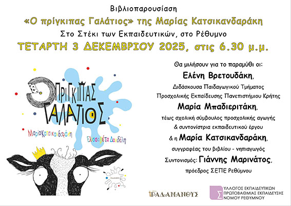 Ο Σύλλογος Εκπαιδευτικών Πρωτοβάθμιας Εκπαίδευσης Νομού Ρεθύμνου και οι Εκδόσεις Ραδάμανθυς παρουσιάζουν το παραμύθι της Μαρίας Κατσικανδαράκη «Ο πρίγκιπας Γαλάτιος», με εικονογράφηση της Ελισσάβετ Δανδάλη, την