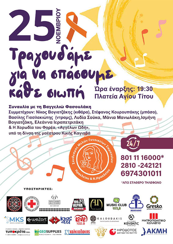 με τους εξαιρετικούς συνεργάτες της Νίκο Βογιατζάκη (κιθάρα), Στέφανο Κουρουπάκη (μπάσο), Βασίλη Γιασλακιώτη (ντραμς), Λυδία Σούκα, Μάνια Μανωλάκη, Ισμήνη Βογιατζάκη και Ελεάννα Ιεραπετριτάκη προσφέροντας εθελοντικά μία βραδιά μελωδιών που μεταφέρουν δύναμη, ευαισθησία και μηνύματα αλληλεγγύης ενάντια στην έμφυλη βία και κάθε μορφής κακοποίηση γυναικών και κοριτσιών.