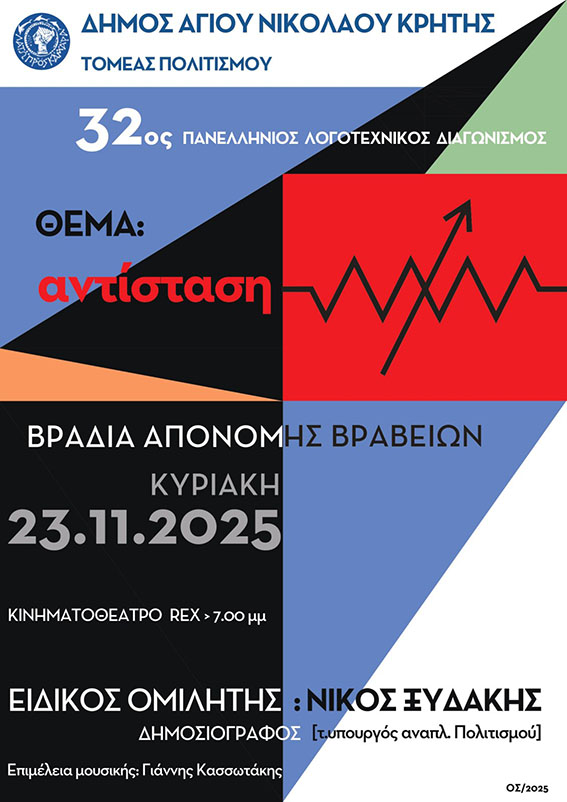 Ολοκληρώθηκε ο 32ος Πανελλήνιος Λογοτεχνικός Διαγωνισμός του Τομέα Πολιτισμού του Δήμου Αγίου Νικολάου, με θέμα «Αντίσταση», αφιερωμένος στη μνήμη των αείμνηστων Αντιστασιακών Γεωργίου Χατζηδάκη και Δώρας Φθενάκη – Κοκολάκη.