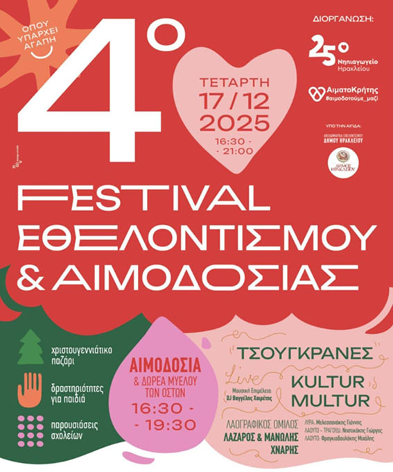 Μια μεγάλη ανοιχτή γιορτή αφιερωμένη στην προσφορά, τη συνεργασία και την ανθρώπινη αλληλεγγύη διοργανώνεται στο Ηράκλειο, με αφορμή το 4ο Φεστιβάλ Εθελοντισμού & Αιμοδοσίας, που θα πραγματοποιηθεί την