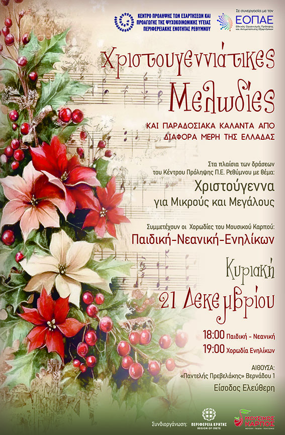 Η εκδήλωση πραγματοποιείται σε συνδιοργάνωση με την Περιφέρεια Κρήτης, το Κέντρο Πρόληψης Ρεθύμνου και τον Εθνικός Οργανισμός Πρόληψης και Αντιμετώπισης Εξαρτήσεων, αναδεικνύοντας τη δύναμη της συνεργασίας ανάμεσα στον πολιτισμό, την κοινωνική φροντίδα και την πρόληψη.