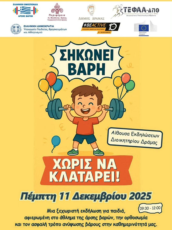 Μία ημέρα πριν από την έναρξη του Πανελληνίου Πρωταθλήματος, στο Αμφιθέατρο του Διοικητηρίου Δράμας, από 09:30 έως 12:00, θα πραγματοποιηθεί μια μεγάλη εκπαιδευτική εκδήλωση για μαθητές, αφιερωμένη στην ασφαλή άσκηση, την ορθοσωμία και την πρώτη γνωριμία με το άθλημα της άρσης βαρών.