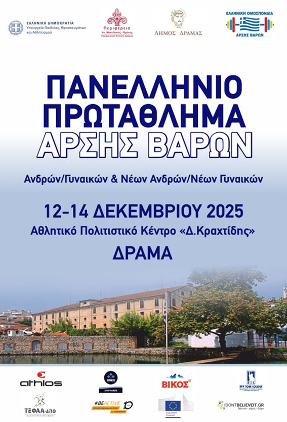 Από την Παρασκευή 12 έως την Κυριακή 14 Δεκεμβρίου, η πόλη της Δράμας θα φιλοξενήσει το Πανελλήνιο Πρωτάθλημα Άρσης Βαρών Ανδρών/Γυναικών & Νέων Ανδρών/Νέων Γυναικών, στο Αθλητικό Πολιτιστικό Κέντρο «Δ. Κραχτίδης».