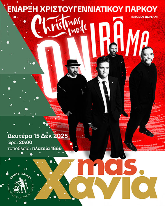 Με μια εντυπωσιακή συναυλία από το δημοφιλές συγκρότημα ONIRAMA, σε μια ατμόσφαιρα γεμάτη χριστουγεννιάτικη μαγεία, γλυκίσματα και αρωματικά ροφήματα, ανοίγει τις πύλες του το Χριστουγεννιάτικο Πάρκο του Δήμου Χανίων στην πλατεία 1866, τη