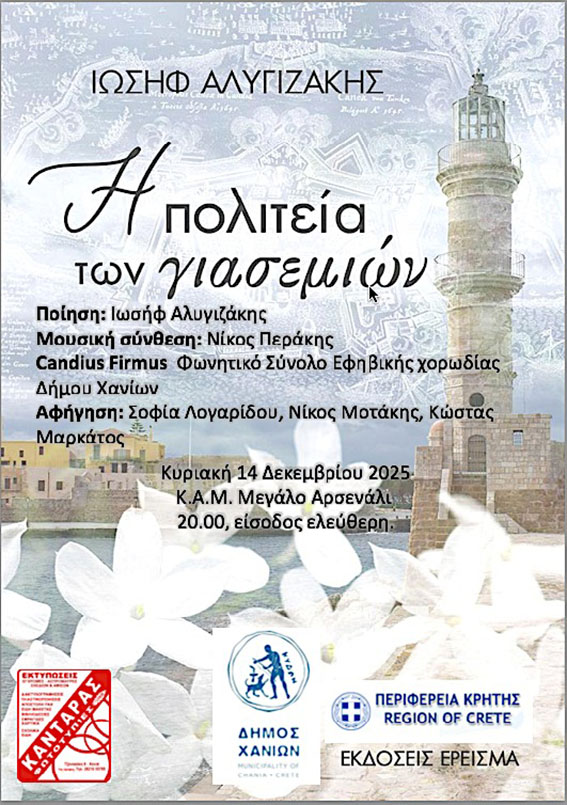 Η παράσταση βασίζεται στη μελοποιημένη ποίηση του μυθιστορήματος «Η Πολιτεία των γιασεμιών» του Ιωσήφ Αλυγιζάκη, σε μουσική σύνθεση του Νίκου Περάκη, η οποία θα αποδοθεί από το Candius Firmus, το φωνητικό σύνολο της εφηβικής χορωδίας του Δήμου Χανίων. Η μουσική και ο λόγος συνυπάρχουν, δημιουργώντας μια ατμόσφαιρα βαθιάς συγκίνησης και στοχασμού.