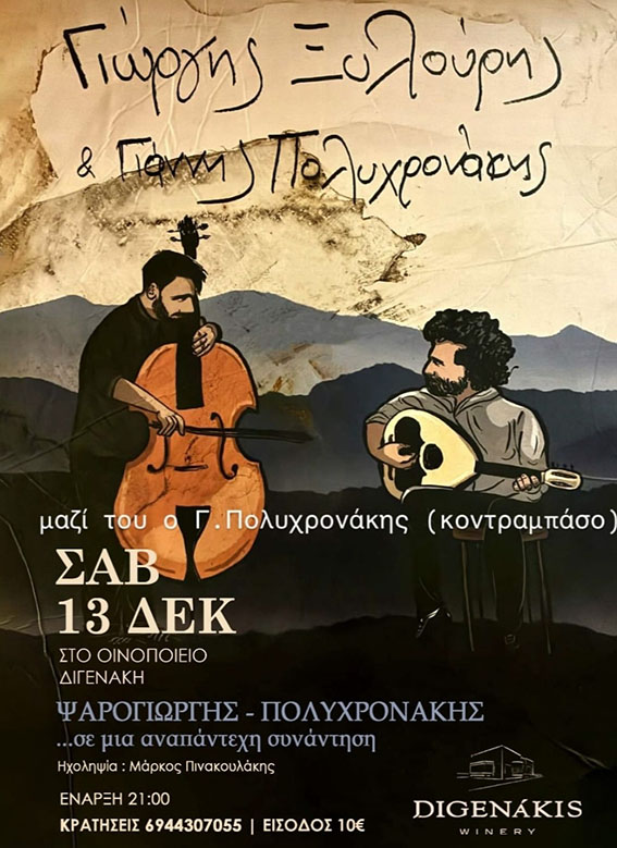 Στο ζεστό περιβάλλον του Οινοποιείου Διγενάκη, ανάμεσα στα βαρέλια, τα αρώματα του κρασιού και τη χειμωνιάτικη ατμόσφαιρα της κρητικής υπαίθρου, γεννιέται μια μουσική συνεύρεση που δύσκολα συναντά κανείς. Ο Ψαρογιώργης με το λαούτο του και ο Γιάννης Πολυχρονάκης στο κοντραμπάσο μοιράζονται για πρώτη φορά την ίδια σκηνή μέσα στο οινοποιείο.