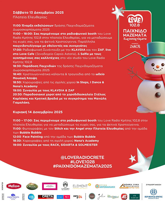 Η ημέρα ξεκινά στις 11:00 με την έναρξη της δράσης Παιχνιδομαζέματα – Δωροσκορπίσματα 2025, ενώ από τις 11:00 έως τις 18:00 το ραδιοφωνικό booth του Love Radio Κρήτης 102.8 μεταδίδει ζωντανά τις ευχές του κόσμου για τα φετινά Χριστούγεννα, με τη συμμετοχή εθελοντών και συνεργατών.