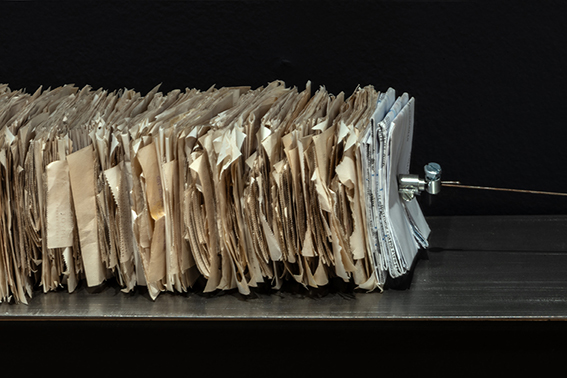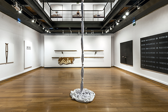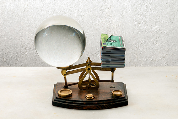 όπου έχει τοποθετήσει στον έναν δίσκο της ζυγαριάς μια γυάλινη σφαίρα- υδρόγειος χωρίς χώρες, και στον άλλο 37 πιστωτικές κάρτες, ως σχόλιο στους μηχανισμούς του όψιμου καπιταλισμού και την εξάρτησή του από το «πλαστικό» χρήμα, στις δυτικές κοινωνίες, οι επισκέπτες καλούνται να μυηθούν στο εικαστικό λεξιλόγιο και στους διαχρονικούς προβληματισμούς που θέτει η καλλιτέχνις.