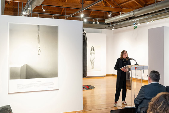 Φανερά συγκινημένη, η Λυδία Δαμπασίνα, αφού ευχαρίστησε όλους τους συντελεστές για τη συνεργασία, στάθηκε στο έργο-έμβλημα της έκθεσης «Μαχαίρι στο κόκκαλο» και στη συγκυρία μέσα στην οποία το δημιούργησε.
