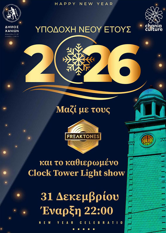 Παραμονή Πρωτοχρονιάς, στις 22:00, στην οδό Πλουμιδάκη, κάτω από το Ρολόι του Δημοτικού Κήπου Χανίων, ο Δήμος Χανίων σας προσκαλεί σε μια φαντασμαγορική εκδήλωση με ζωντανή μουσική από τους