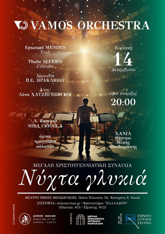 Μια ξεχωριστή μουσική βραδιά έρχεται στα Χανιά, καθώς η Ορχήστρα Vamos παρουσιάζει τη χριστουγεννιάτικη συναυλία «Νύχτα γλυκιά», με έργα κλασικών συνθετών, ύμνους, μελωδίες και κάλαντα. Η εκδήλωση θα πραγματοποιηθεί στο Θέατρο Μίκης Θεοδωράκης, την