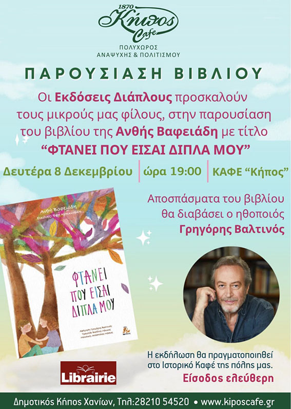 στις 19:00, η παρουσίαση του νέου παιδικού βιβλίου της Ανθής Βαφειάδη με τίτλο «Φτάνει που είσαι δίπλα μου», που κυκλοφορεί από τις Εκδόσεις Δίαπλους.