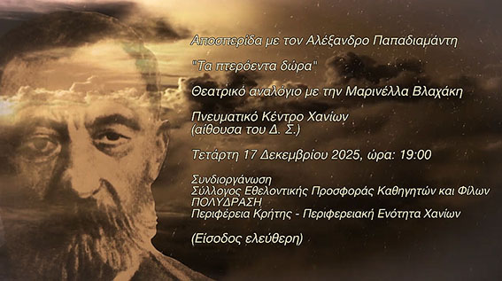 Μια ξεχωριστή λογοτεχνική αποσπερίδα αφιερωμένη στον Αλέξανδρο Παπαδιαμάντη, τον «άγιο των ελληνικών γραμμάτων», φιλοξενείται στα Χανιά, μέσα από μια εκδήλωση λόγου και μνήμης που αναδεικνύει τη διαχρονική δύναμη της ελληνικής γραφής.
