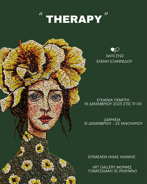 Η έκθεση σύγχρονης τέχνης «THERAPY» της εικαστικού Ελένης Ιωαννίδου παρουσιάζεται στη Γκαλερί Μορφές στο Ρέθυμνο, φιλοξενούμενη στον εκθεσιακό χώρο της οδού Γοβατζιδάκη 18, από τις