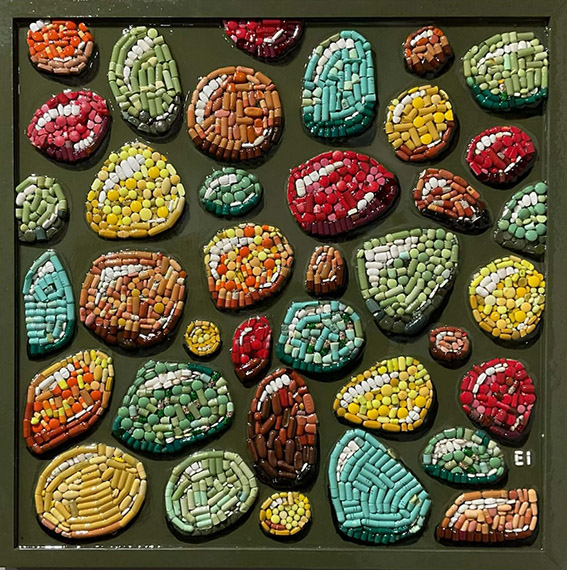 Πρόκειται για μια πρωτότυπη και βαθιά συμβολική εικαστική πρόταση, όπου ληγμένα χάπια και κάψουλες μεταμορφώνονται σε ψηφίδες μωσαϊκών, αποκτώντας μια νέα ζωή πέρα από τον αρχικό τους ρόλο.