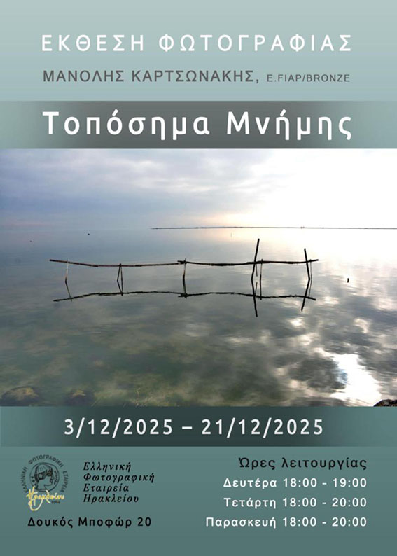 Με μια ιδιαίτερη έκθεση που επιχειρεί να συλλάβει το ίχνος της μνήμης μέσα στον τόπο, ο φωτογράφος Μανώλης Καρτσωνάκης (E.FIAP/BRONZE) παρουσιάζει την ατομική του δουλειά «Τοπόσημα Μνήμης» στην
