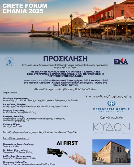Μια σημαντική ενημερωτική εκδήλωση για τον ρόλο της τεχνολογίας στη σύγχρονη αυτοδιοίκηση θα πραγματοποιηθεί στα Χανιά, στο πλαίσιο του «Crete Forum Chania 2025», το οποίο θα διεξαχθεί την