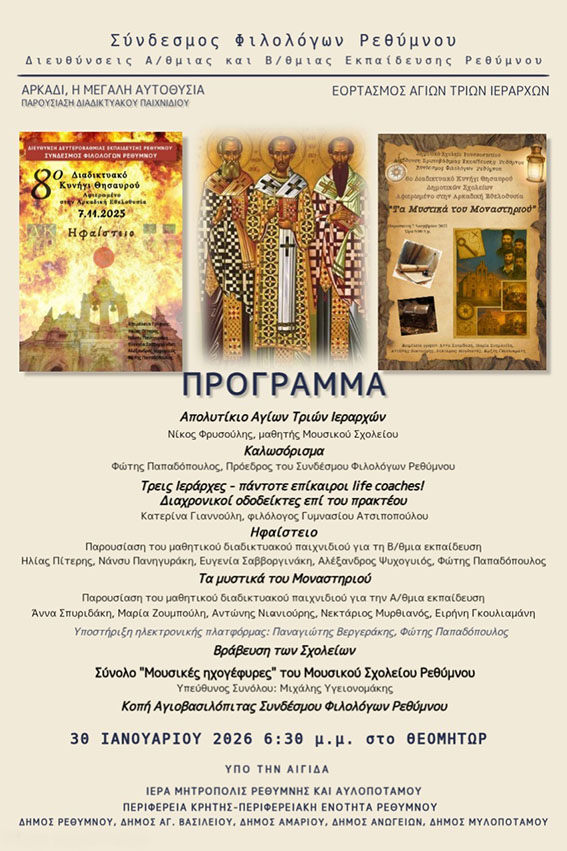 Μια ξεχωριστή εκδήλωση αφιερωμένη στους Αγίους Τρεις Ιεράρχες, προστάτες της Παιδείας και των Γραμμάτων, διοργανώνει ο Σύνδεσμος Φιλολόγων Ρεθύμνου, σε συνεργασία με τις Διευθύνσεις Πρωτοβάθμιας και Δευτεροβάθμιας Εκπαίδευσης Ρεθύμνου.