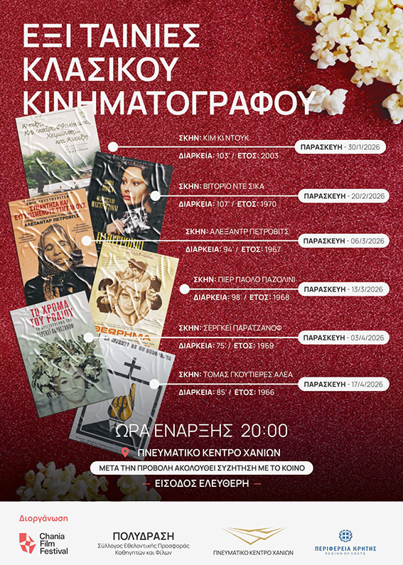 Έναν ξεχωριστό κύκλο έξι ταινιών του κλασικού κινηματογράφου παρουσιάζει ο Σύλλογος Εθελοντικής Προσφοράς Καθηγητών και Φίλων «Πολυδράση», σε συνδιοργάνωση με την Περιφέρεια Κρήτης – Περιφερειακή Ενότητα Χανίων, το Πνευματικό Κέντρο Χανίων και το Φεστιβάλ Κινηματογράφου Χανίων.