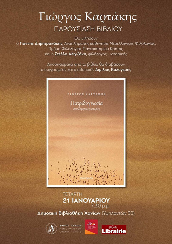 στις 7:30 μ.μ., με αφορμή την παρουσίαση του βιβλίου «Πατριδογνωσία» του Γιώργος Καρτάκης.