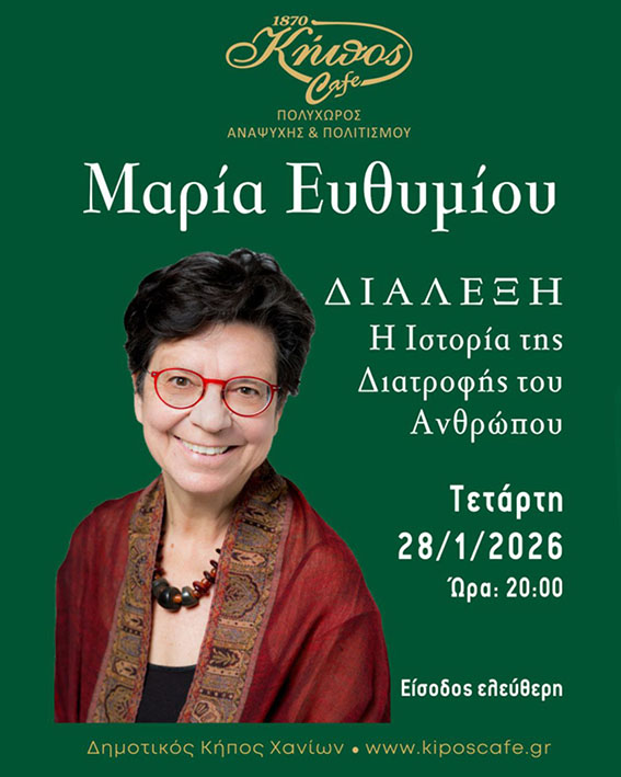 στις 20:00, στον χώρο του Κήπος Cafe, με τη διάλεξη της διακεκριμένης ιστορικού Μαρίας Ευθυμίου με θέμα «Η Ιστορία της Διατροφής του Ανθρώπου».