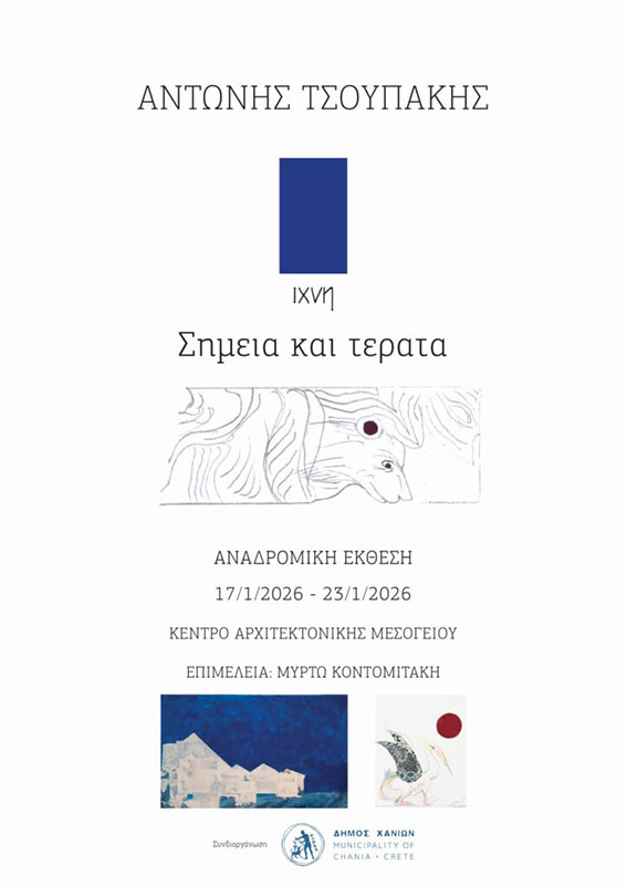 Η έκθεση, που συνδιοργανώνεται από τον Δήμο Χανίων, τιμά τον πρόσφατα εκλιπόντα εικαστικό Αντώνη Τσουπάκη, έναν δημιουργό που άφησε έντονο αποτύπωμα στην καλλιτεχνική και ακαδημαϊκή ζωή της Κρήτης.
