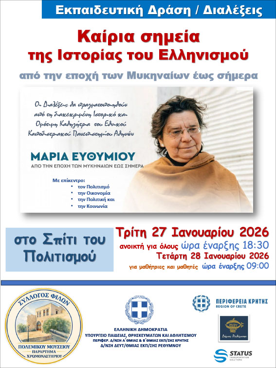 Ο Σύλλογος Φίλων Πολεμικού Μουσείου – Παράρτημα Χρωμοναστηρίου, σε συνεργασία με τη Διεύθυνση Δευτεροβάθμιας Εκπαίδευσης Ρεθύμνου, διοργανώνουν ομιλίες με τίτλο: