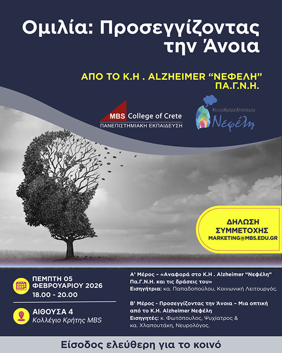 Το Κέντρο Ημέρας Alzheimer Ηρακλείου «Νεφέλη», στο πλαίσιο των δράσεών του προς την κοινότητα και σε συνεργασία με το MBS College, διοργανώνει ενημερωτική ομιλία με τίτλο