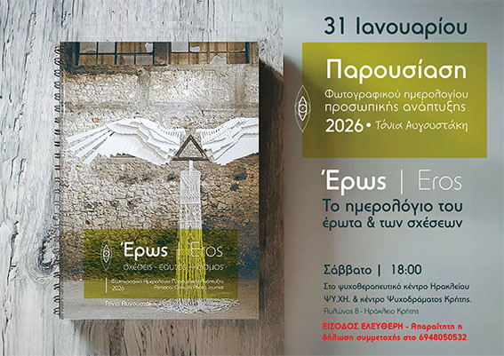 Στις 18:00, θα πραγματοποιηθεί η παρουσίαση του φωτογραφικού ημερολογίου προσωπικής ανάπτυξης της Τόνια Αυγουστάκη, με θεματικό άξονα τον Έρωτα και τις συντροφικές σχέσεις.