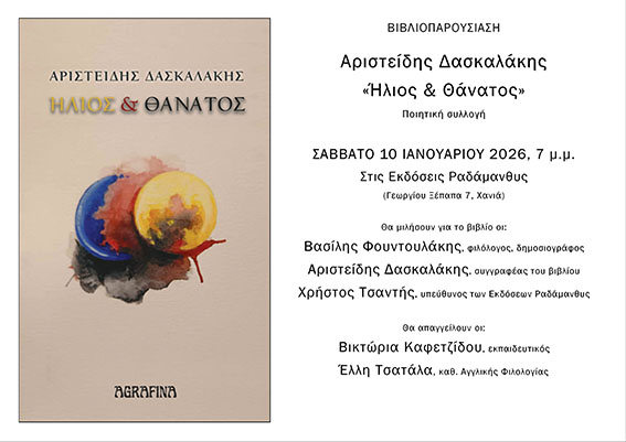 Οι Εκδόσεις Ραδάμανθυς προσκαλούν το κοινό στην παρουσίαση της ποιητικής συλλογής Ήλιος & Θάνατος του Αριστείδης Δασκαλάκης, η οποία κυκλοφορεί από τις Εκδόσεις Agrafina.