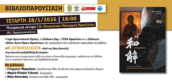 Την εκδήλωση συνδιοργανώνουν η Ιερά Αρχιεπισκοπή Κρήτης, οι εκδόσεις Έαρ, η ΓΕΧΑ Ηρακλείου και ο Σύλλογος “Φίλοι Αγίου Όρους Ηρακλείου”, προσκαλώντας το κοινό σε έναν ουσιαστικό διάλογο γύρω από την έννοια της συμφιλίωσης, της πνευματικής αναζήτησης και της διαδρομής πίστης μέσα από διαφορετικούς πολιτισμούς.