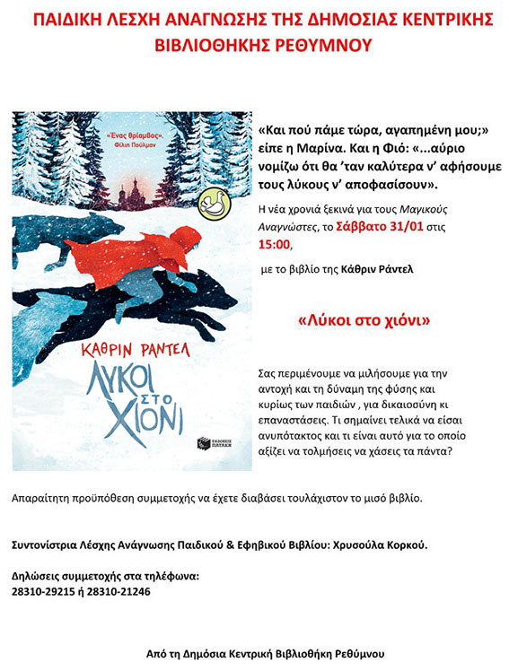 στις 15:00, η Παιδική Λέσχη Ανάγνωσης ανοίγει τις σελίδες του βιβλίου Λύκοι στο χιόνι της Κάθριν Ράντελ και προσκαλεί παιδιά και οικογένειες σε ένα ταξίδι γεμάτο ερωτήματα και συναισθήματα.