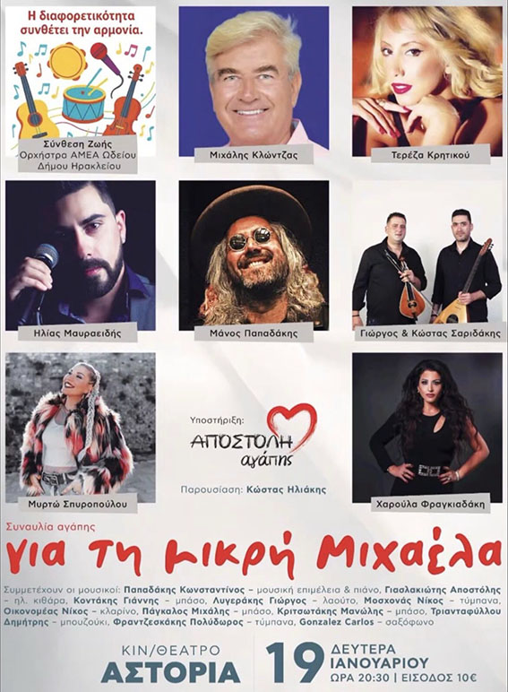 στο Κινηματοθέατρο Αστόρια, όπου αγαπημένοι καλλιτέχνες της Κρήτης ενώνουν τις δυνάμεις και τις φωνές τους για τη μικρή Μιχαέλα, ένα κοριτσάκι μόλις 3 ετών που δίνει τη δική της γενναία μάχη, αντιμετωπίζοντας σοβαρό πρόβλημα υγείας με κίνδυνο απώλειας όρασης.