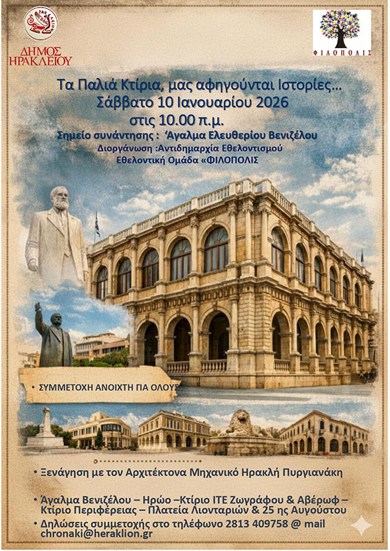 στις 10:00, με σημείο συνάντησης το άγαλμα του Ελευθερίου Βενιζέλου, στην πλατεία Ελευθερίας. Την ξενάγηση και αφήγηση θα αναλάβει εθελοντικά ο αρχιτέκτονας–μηχανικός Ηρακλής Πυργιαννάκης, ο οποίος θα οδηγήσει τους συμμετέχοντες σε μια περιπατητική διαδρομή μνήμης και αρχιτεκτονικής.