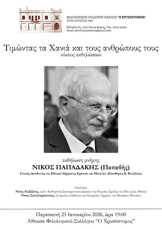 Σε αυτό το πνεύμα, ο Φιλολογικός Σύλλογος Χανίων «Ο ΧΡΥΣΟΣΤΟΜΟΣ» εγκαινιάζει έναν νέο κύκλο εκδηλώσεων με τίτλο «Τιμώντας τα Χανιά και τους ανθρώπους τους», με την πρώτη εκδήλωση να πραγματοποιείται την