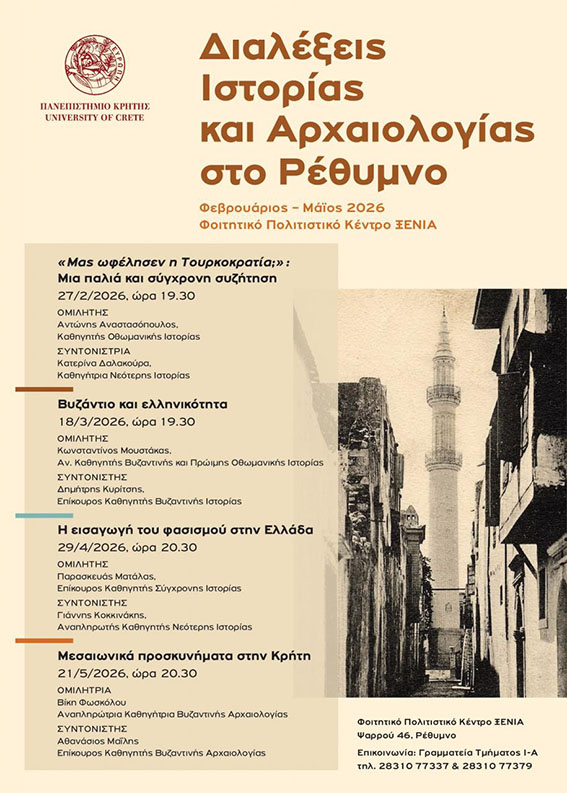 Το Τμήμα Ιστορίας και Αρχαιολογίας του Πανεπιστημίου Κρήτης, στο πλαίσιο της σύνδεσης του Πανεπιστημίου με την τοπική κοινωνία και της διάχυσης της επιστημονικής γνώσης στο ευρύτερο κοινό, προσκαλεί το κοινό σε έναν κύκλο ανοιχτών διαλέξεων με τη συμμετοχή διδασκόντων και προσκεκλημένων ομιλητών. Τα θέματα των εισηγήσεων αντλούνται από τη σύγχρονη ιστορική και αρχαιολογική έρευνα, συνδέοντας το παρελθόν με τα σημερινά κοινωνικά και πολιτιστικά ζητήματα.