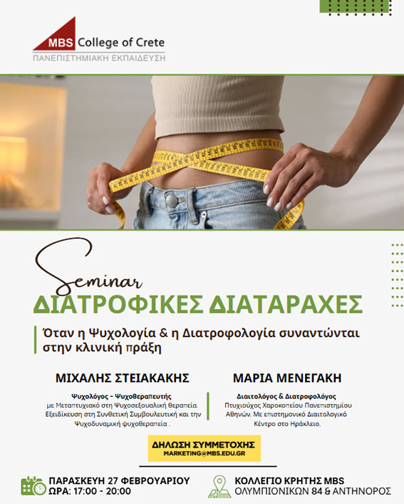 Το σεμινάριο προσεγγίζει τις διατροφικές διαταραχές μέσα από τη διεπιστημονική συνεργασία της ψυχολογίας και της διατροφολογίας, αναδεικνύοντας τη σημασία της συνδυαστικής κλινικής αντιμετώπισης και της σωστής καθοδήγησης από εξειδικευμένους επιστήμονες.