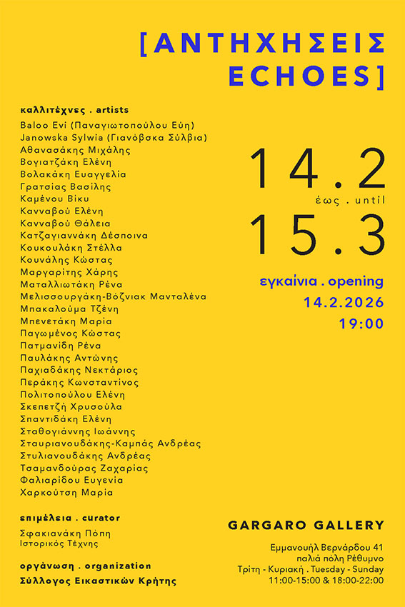 Ο Σύλλογος Εικαστικών Κρήτης παρουσιάζει την ομαδική εικαστική έκθεση «ΑΝΤΗΧΗΣΕΙΣ», η οποία θα φιλοξενηθεί στη Gallery GARGARO στο Ρέθυμνο, από τις