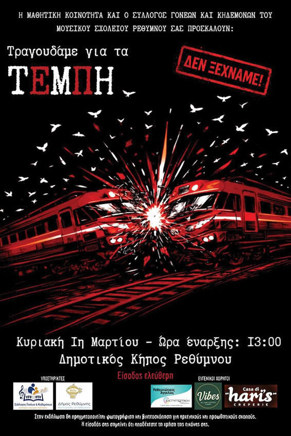 Με αφορμή τη συμπλήρωση τριών χρόνων από το τραγικό δυστύχημα στα Τέμπη, οι μαθητές του Μουσικού Σχολείου Ρεθύμνου, με την υποστήριξη του Συλλόγου Γονέων και Κηδεμόνων, διοργανώνουν μια εκδήλωση μνήμης αφιερωμένη στα θύματα και στις οικογένειές τους, την