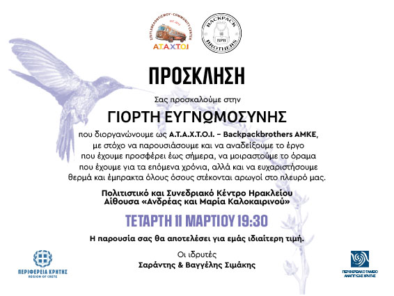 Με ιδιαίτερη χαρά, οι Α.Τ.Α.Χ.Τ.Ο.Ι. – Backpack Brothers ΑΜΚΕ προσκαλούν το κοινό στη «Γιορτή Ευγνωμοσύνης», η οποία θα πραγματοποιηθεί την